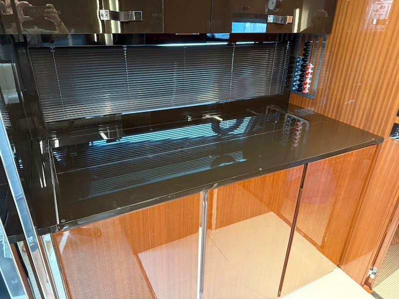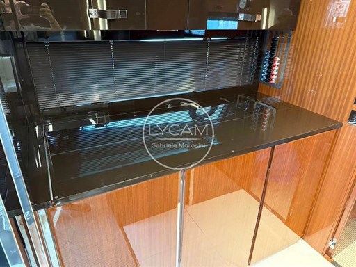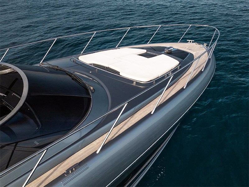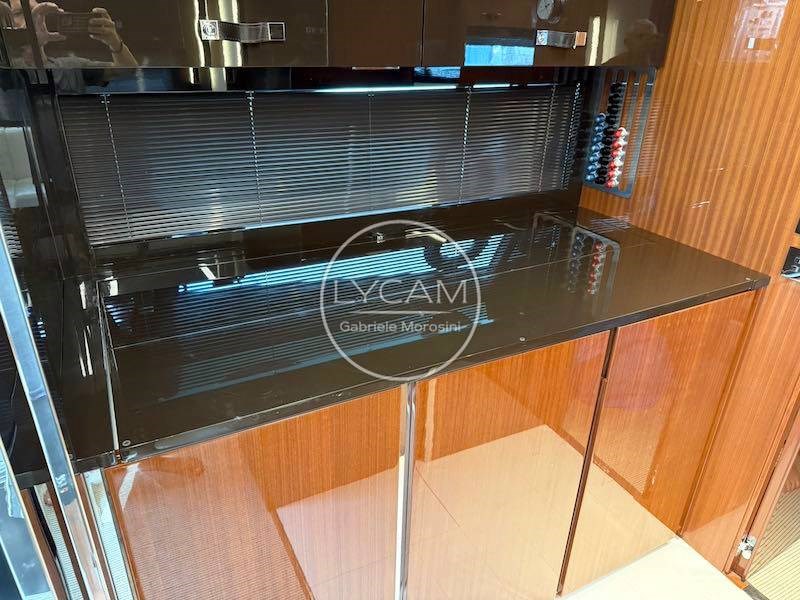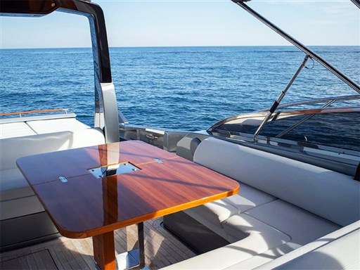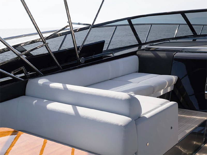 Through the platform applied to the transom that hides the garage for the tender, you can access the deck characterized by an aft sundeck, dinette area with L-shaped sofa along the port side while on the opposite side there is a bar/kitchen cabinet for outdoor meals.