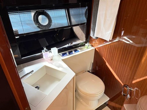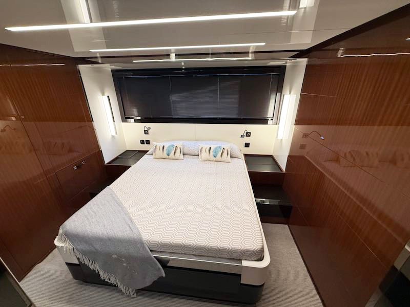 Below deck there is the dinette area with sofa and coffee table on the starboard side, while the galley is on the left. The sleeping area includes 3 cabins with the owner's cabin aft that exploits the entire width of the boat and equipped with its own en suite bathroom. The VIP cabin is in the bow, also with a dedicated bathroom. The third guest cabin has bunk bed and shower room, this bathroom also has day toilet use.