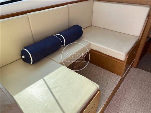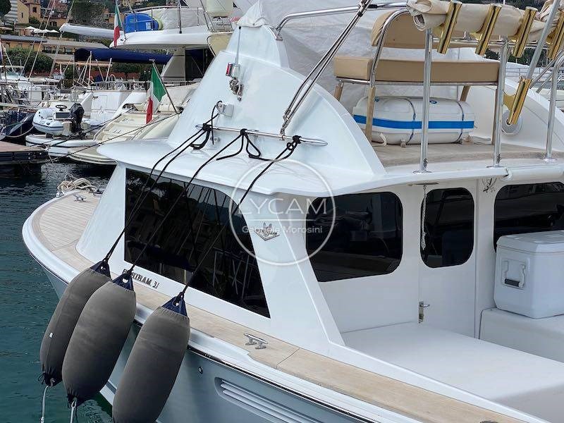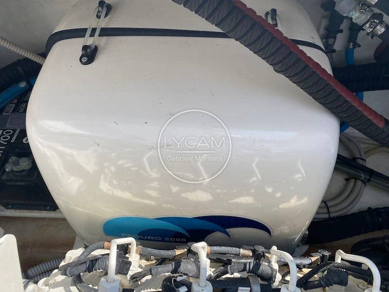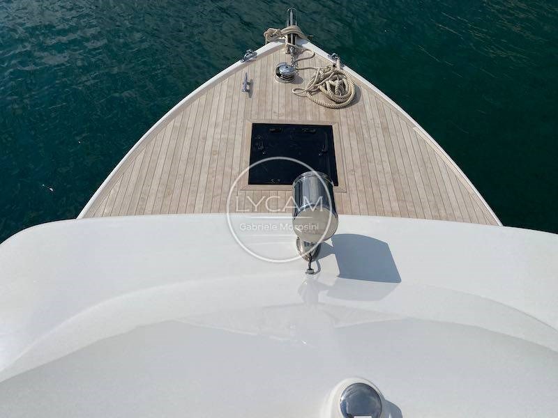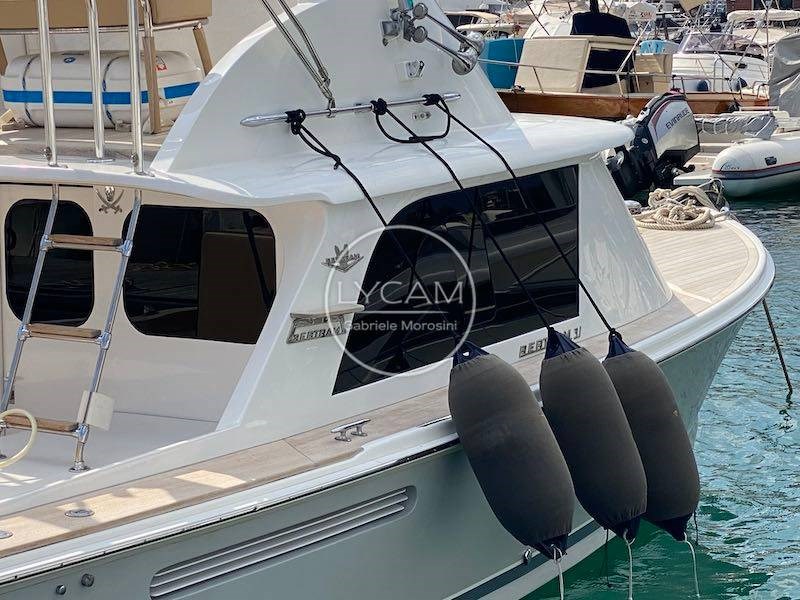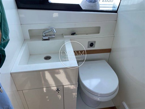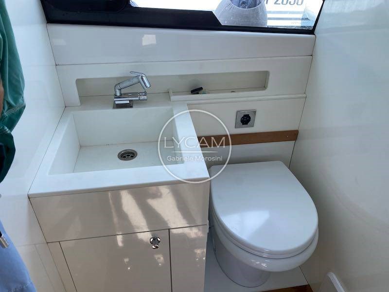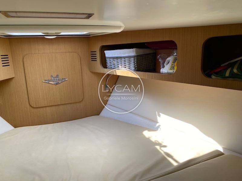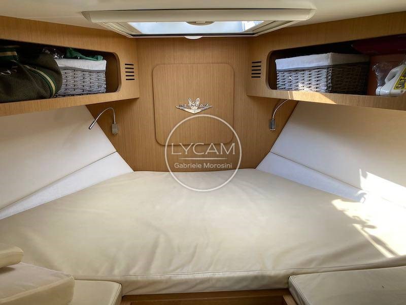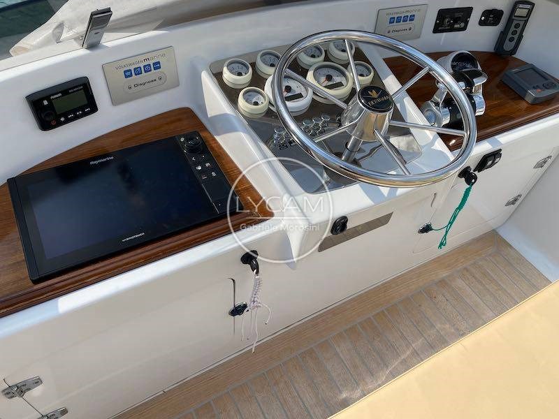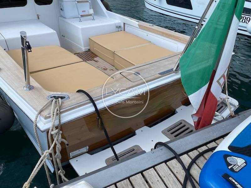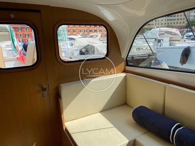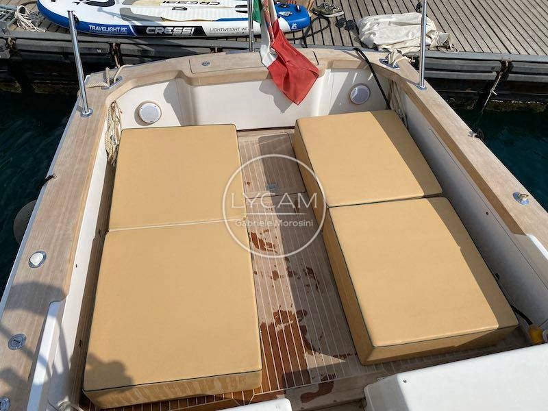The main feature of this iconic model is the large aft cockpit that can be set up as desired either as a convivial area or as a deep-sea fishing station. Proceeding towards the bow, two comfortable sundecks have been created along the bulwarks under which the engines are positioned. A ladder located on the starboard sundeck leads to the flyhybrid. Despite its small size, this deck is equipped with 3 comfortable seats and the external wheelhouse. The superstructure is very compact and inside the dinette has been placed on the port side and the galley on the opposite side. The superstructure is very compact and inside the dinette a sofa has been positioned on the port side and the galley on the opposite side, a cabin with V-shaped berths has been created in the bow and a separate bathroom with toilet and shower on the starboard side, immediately after the entrance.
