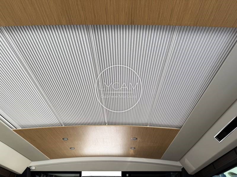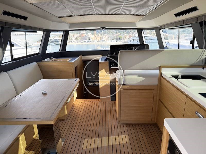 The aft platform leads to the cockpit characterized by a comfortable U-shaped sofa that converts into a sundeck. The large window divides the outdoor convivial area from the internal dinette. This consists of a C-shaped sofa on the left while on the opposite side is the kitchen. Proceeding towards the bow is the wheelhouse with seating for pilot and co-pilot.