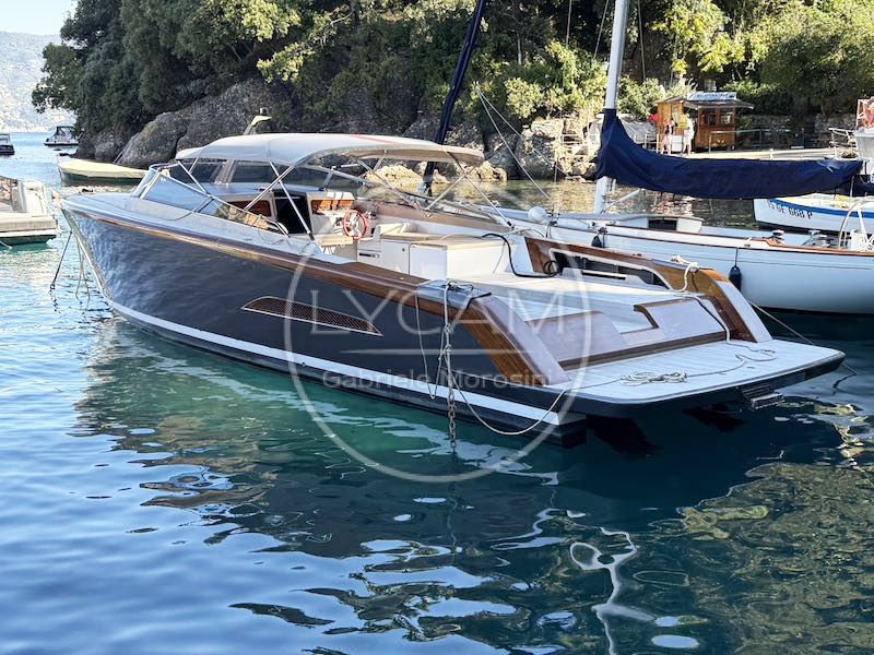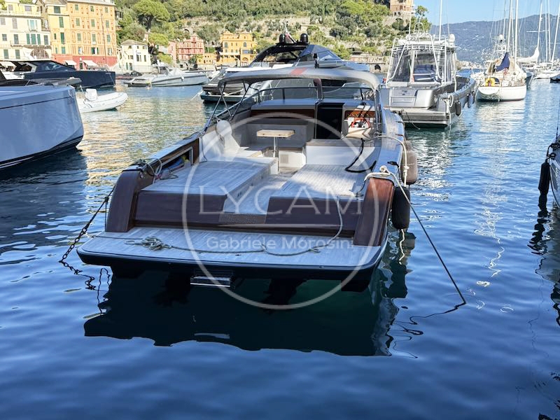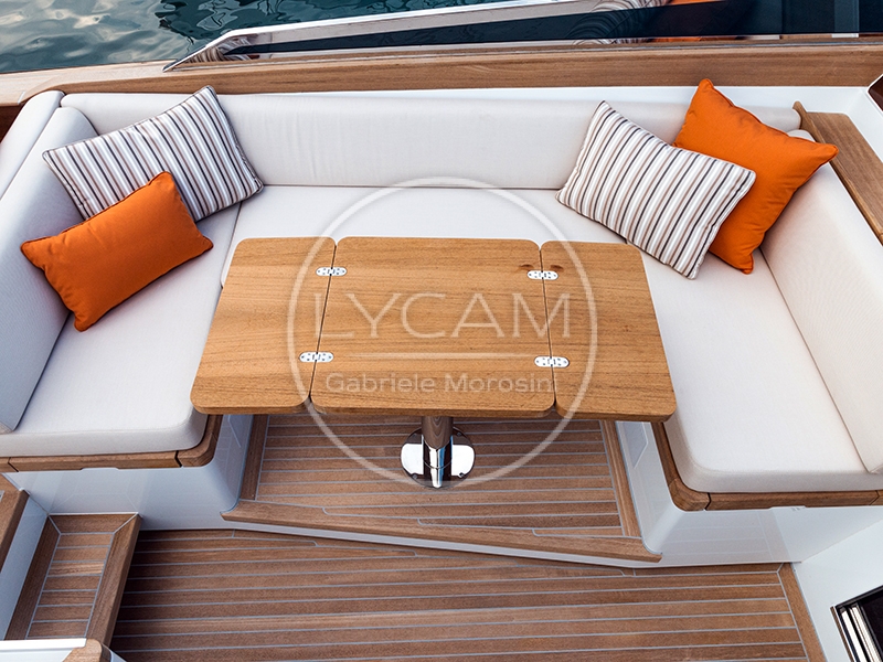 The teak stern platform leads comfortably through a central corridor to the spacious cockpit featuring a double sunpad, a U-shaped dinette on the left side, and a bar/galley cabinet along the opposite side.