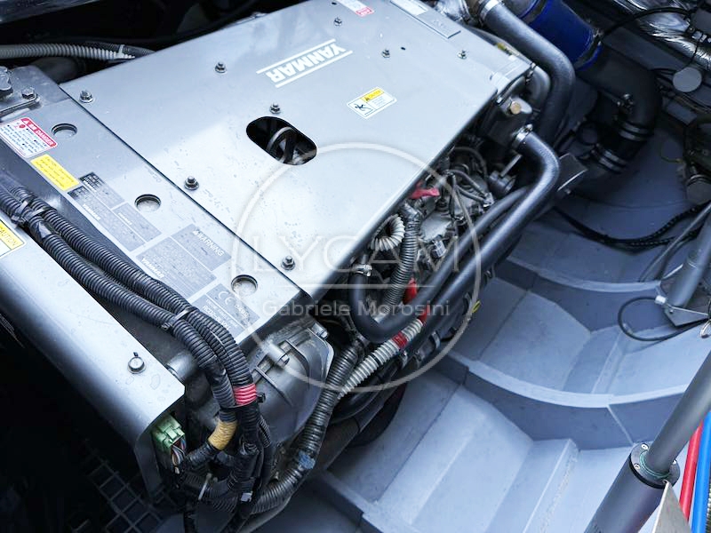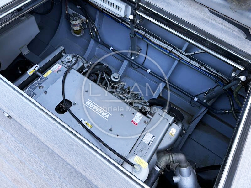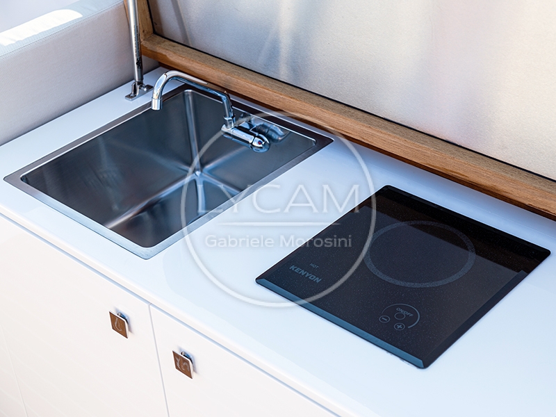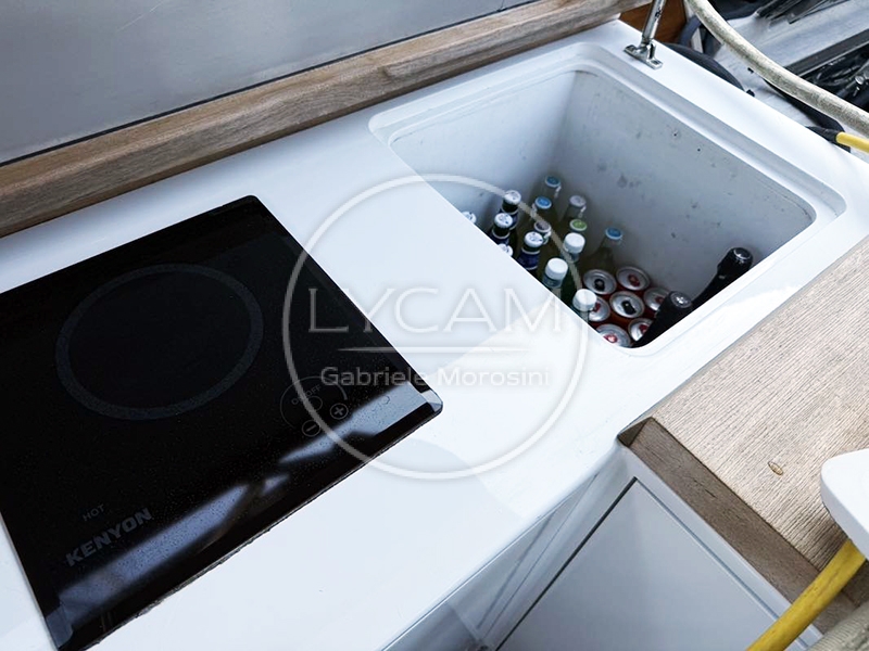 Navigation lights; Anchor light; Mooring cleats; Electric windlass; Anchor; Chain; Bow thruster; Cockpit awning; Teak deck; Swimming ladder; Teak cockpit; Teak gangways; Cockpit table; Aft sundeck cushions; Outdoor sink; Fridge (49 liters); Ice maker; Induction hob; Electric toilet; Service and engine batteries; Battery switch; Battery charger; 220V socket; Parallel; Flagpole; Cockpit speakers; Cockpit shower; Boiler; Boat hook