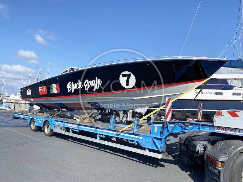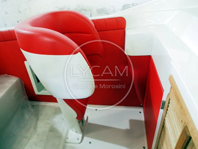 The stern platform leads to the deck characterized by the engine locker at the stern and, further forward, the cockpit. This consists of a sofa for passengers and two single seats for the pilot and co-pilot. The wheelhouse is located on the starboard side.