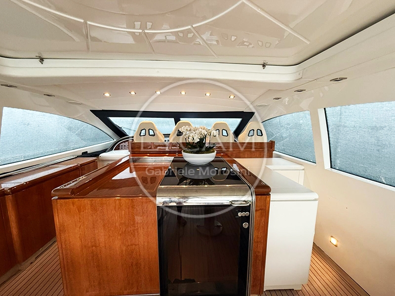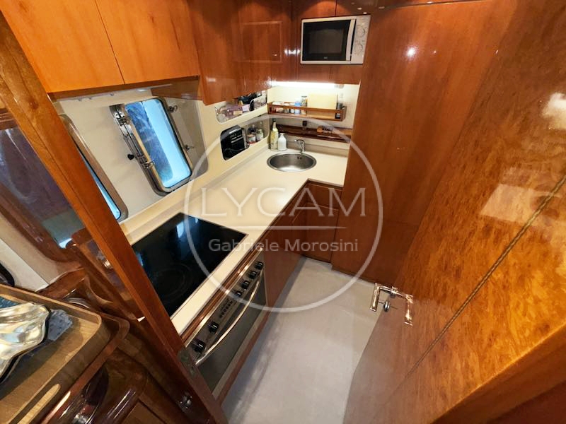 In the Lowe deck, amidships, there is the interior dinette on the port side, while the galley is located on the opposite side.