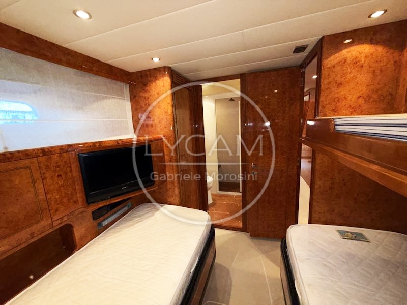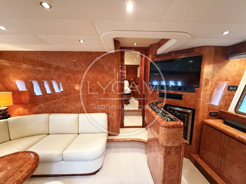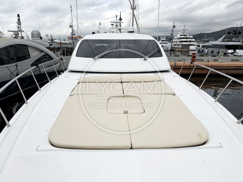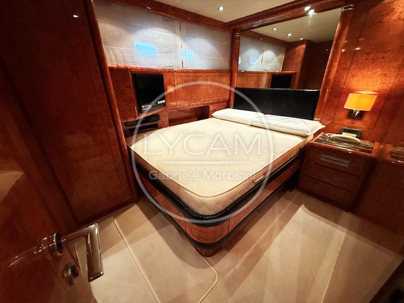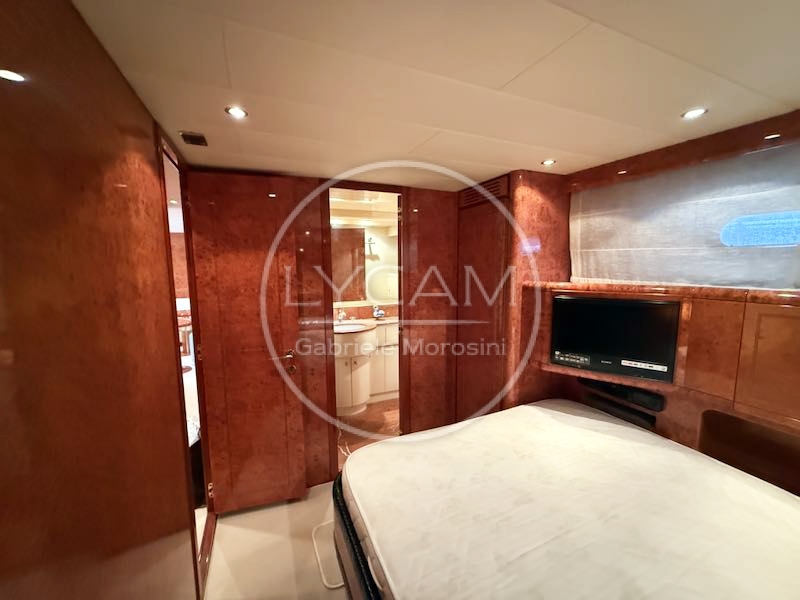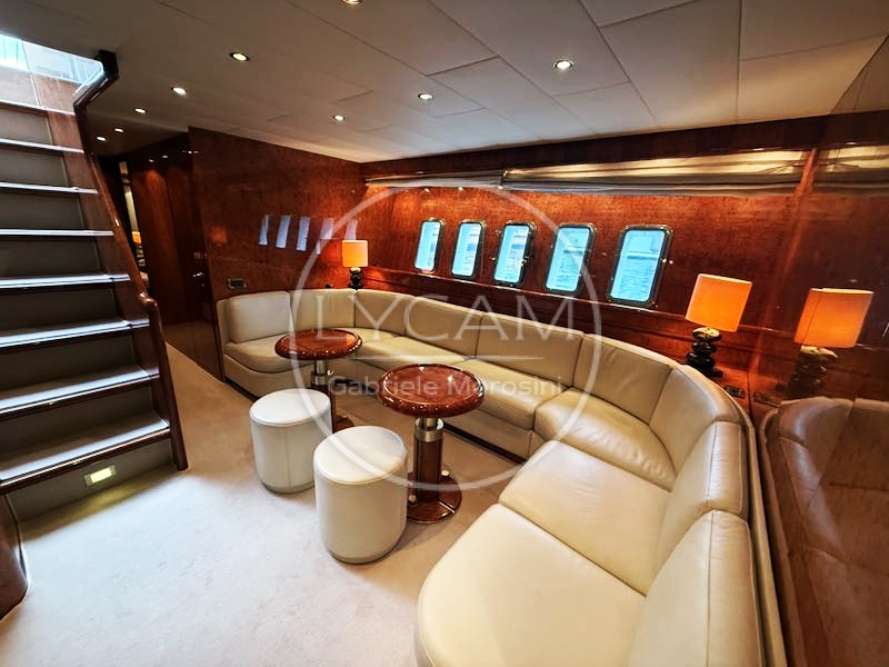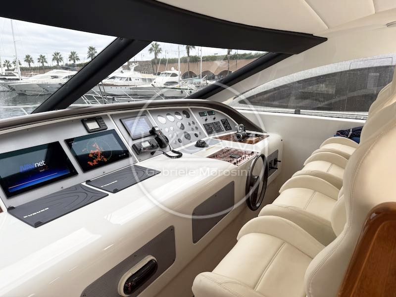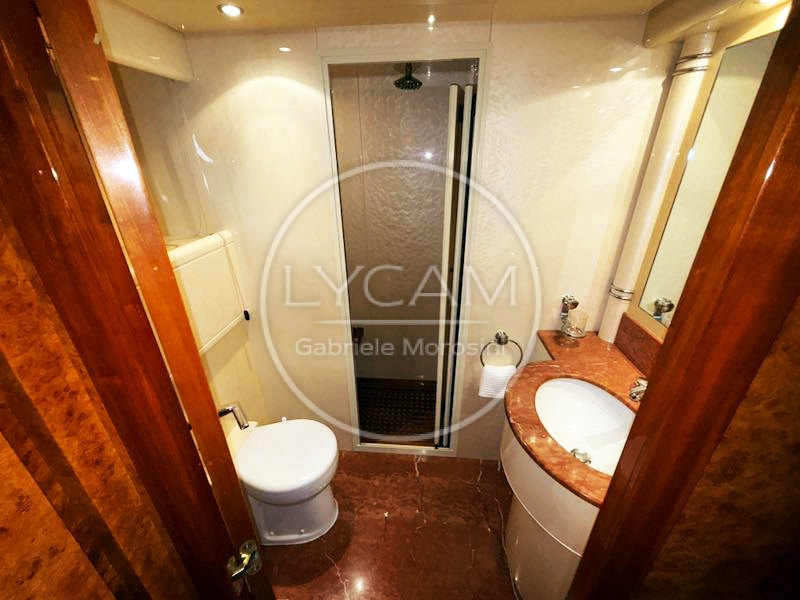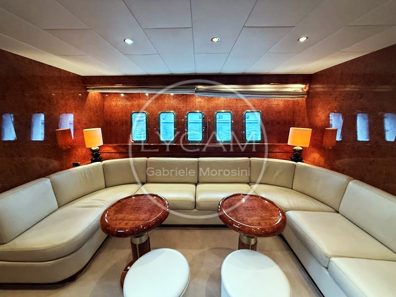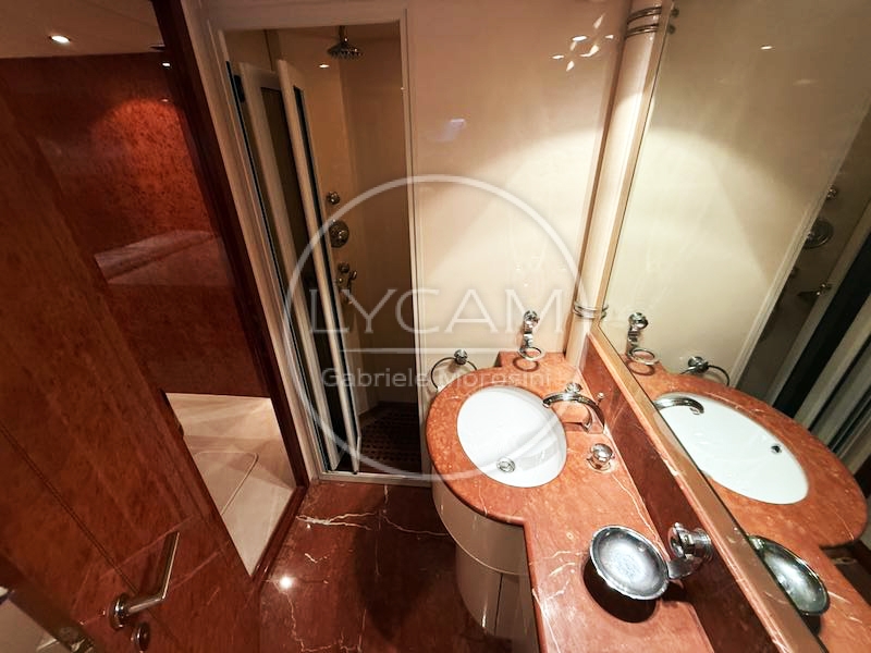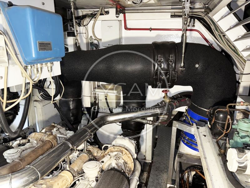 Navigation lights; Anchor light; Anchor; Electric windlass; 2 Onan generators (13 and 17 kW); 8 service batteries; 4 engine batteries; 4 bow thruster batteries; Battery switch; 220V socket; Battery charger; Bow thruster; Automatic bilge pumps; Satellite TV antenna; Idromar 300-liter watermaker; TV; Besenzoni hydraulic gangway; Refrigerator; Miele washer/dryer; Air conditioner; Hot water boiler (50 liters); 2 Eurovinil self-inflating life rafts (2016); Sunbathing cushions; Teak cockpit; Cockpit winter enclosure awnings; Tender Williams Turbojet