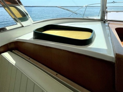 Elaborando il progetto originale Bertram, Riva adatta qui gli spazi alle esigenze mediterranee, creando una barca più vicina alla nautica nostrana e ai conseguenti usi. Il pozzetto sfrutta così i due cofani dei motori – montanti V Drive – e ricava un pratico e confortevole prendisole che, quando non utilizzato, si può ripiegare su se stesso, lasciando libero il pozzetto.