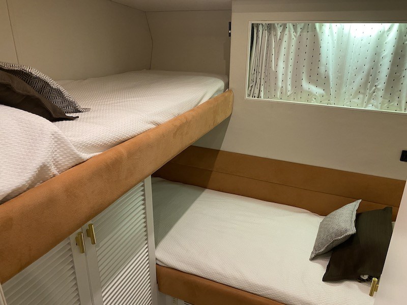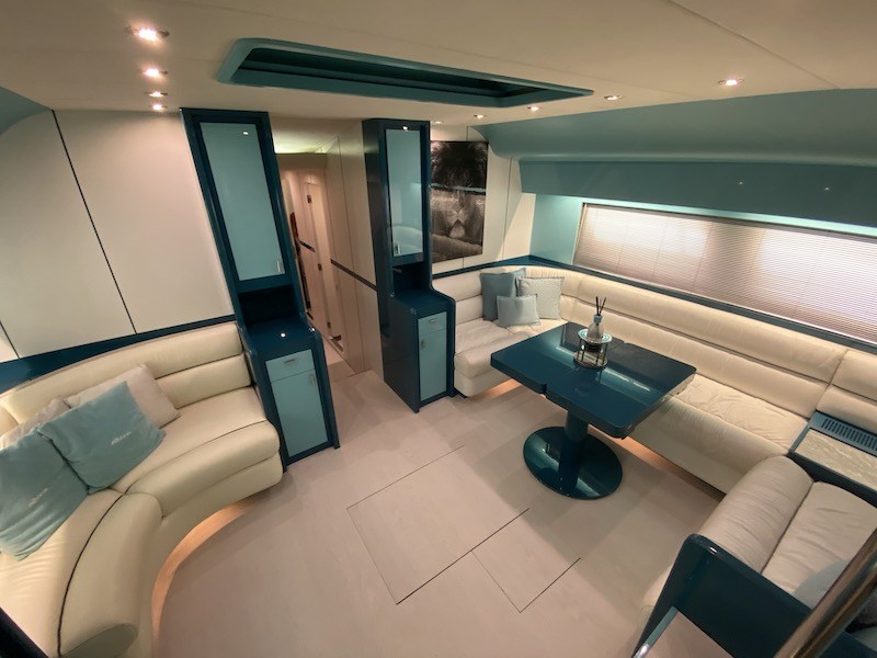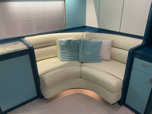 Attraverso la plancetta integrata nello specchio di poppa si accede all’ampio pozzetto composto da comodo prendisole, dinette a C e timonieri sul lato di dritta; mobile bar lungo la murata sinistra. Sottocoperta la dinette è costituita da divano a C servito da attrezzata cucina posta lungo fianco sinistro. Verso prua sono posizionate specularmente le due cabine ospiti con letti a L servite da un bagno. La zona prodiera è riservata alla cabina armatoriale con bagno en-