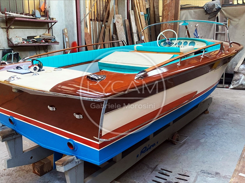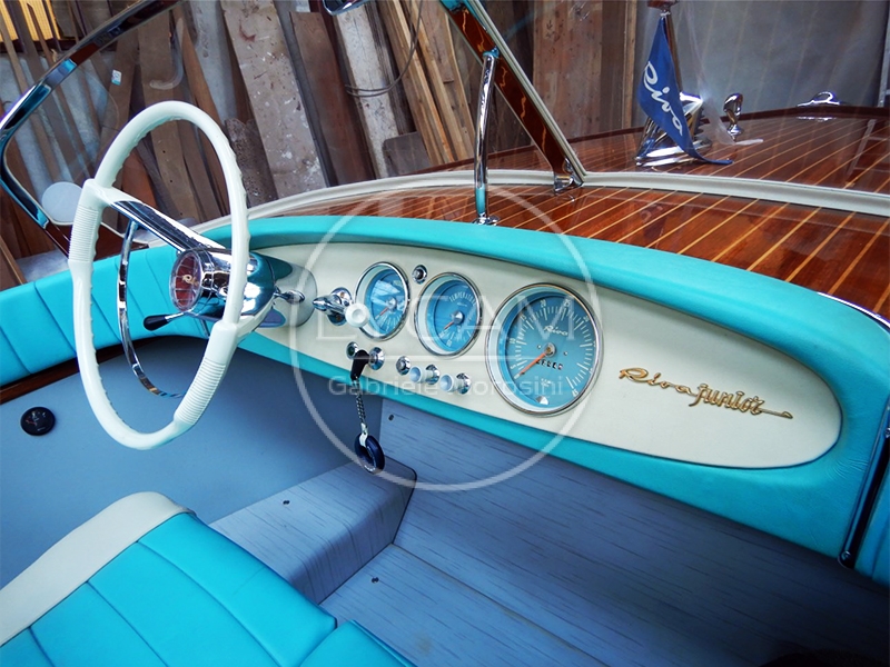 Presentato al Salone di Genova nel 1966 come la “bomba dei giovani”, il Riva Junior costituisce un validissimo esempio di motoscafo versatile in grado di coniugare al meglio l’aspetto familiare a quello ludico legato alla pratica degli sport del mare. L’obiettivo di Carlo Riva è quello di creare una barca facile da condurre e da mantenere così da permettere ai suoi armatori (anche più giovani) di praticare tranquillamente attività come la pesca e lo sci d’acqua assaporando al meglio la vita di mare. Diversi sono gli elementi che rendono unico questo modello a partire dalle murate verniciate a smalto bianco a buccia d’arancia tipiche degli Utility vessel americani degli anni Sessanta. Altro aspetto singolare è la forma della poppa che, anziché essere a botte come i classici runabout Riva, presenta un aggetto verso l’esterno così da proteggere i passeggeri dagli spruzzi del mare nelle andature portanti. Un’ulteriore particolarità sono le bitte che, invece di essere delle tradizionali gallocce, sono a forma di anello per rendere più facili eventuali operazioni di alaggio/varo. Come tutti i motoscafi Riva, pure lo Junior ha annoverato importanti armatori del jet set internazionale tra cui Brigitte Bardot, Liz Taylor e Richard Burton.