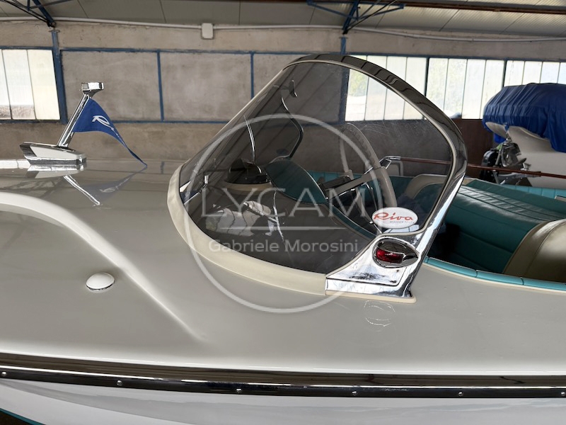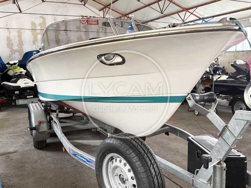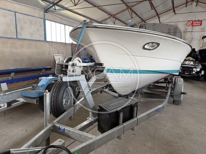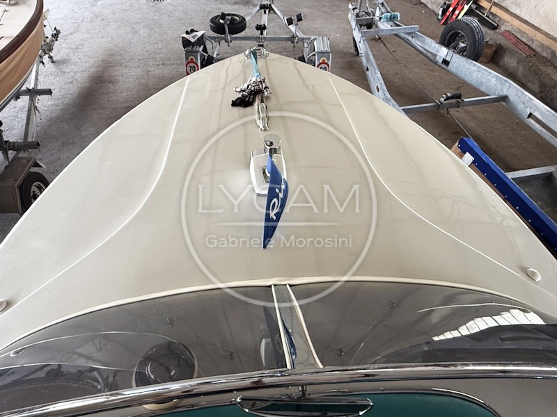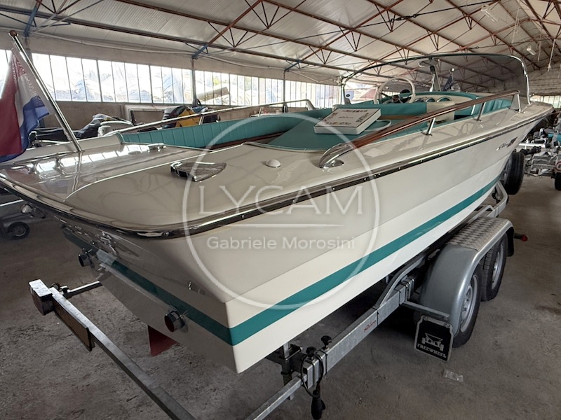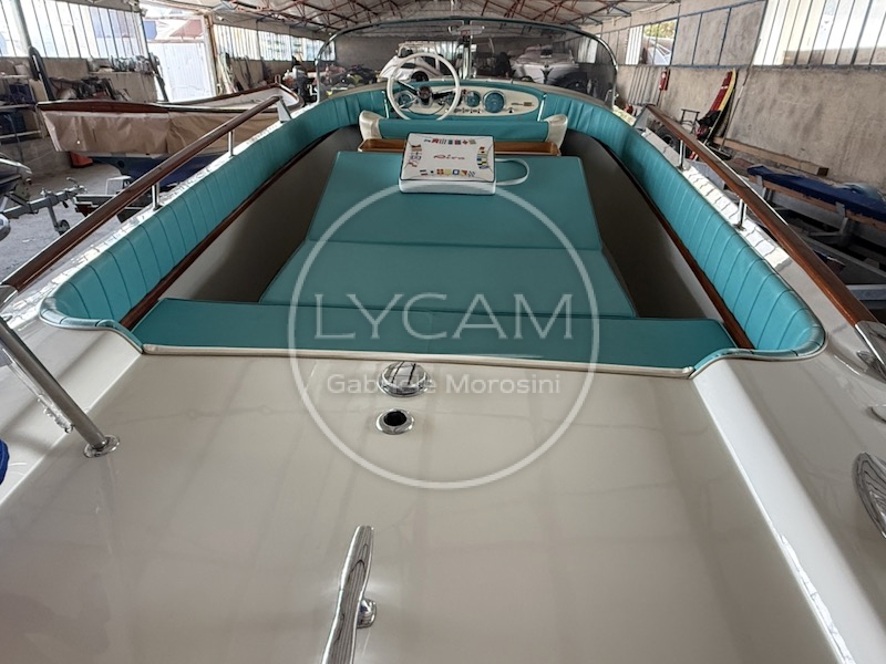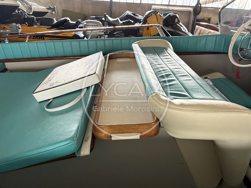 Progettato dall’Architetto Barilani per essere realizzato in vetroresina, mantiene però alcuni dettagli in mogano come i corrimano laterali e il ripiano porta oggetti alle spalle della seduta di pilotaggio conferendo alla barca una maggiore ricercatezza.